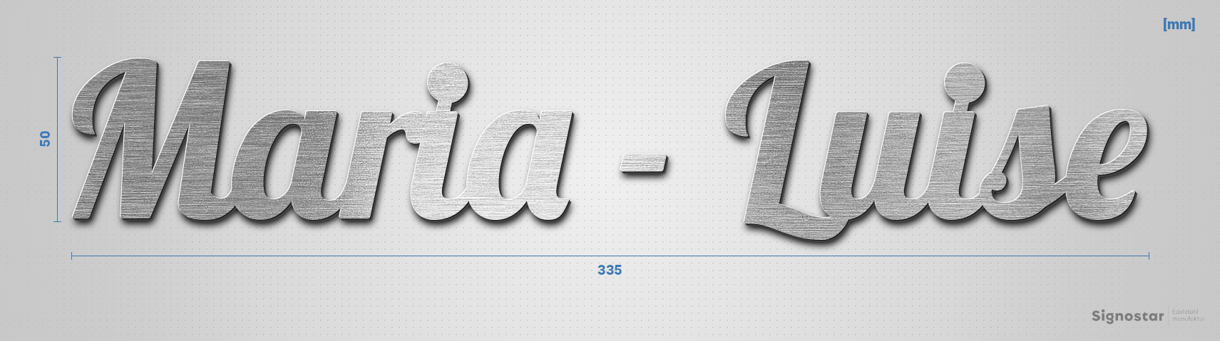 Hochwertiger, witterungsbeständiger Schriftzug "Maria - Luise" aus gebürstetem Edelstahl V2A (1.4301)