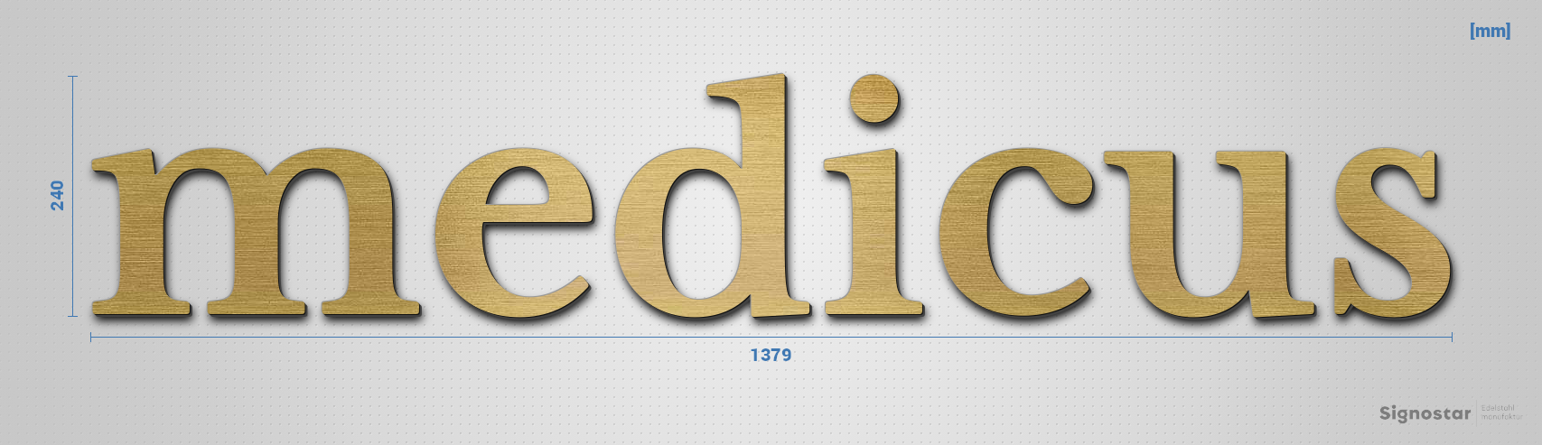 Hochwertiger, witterungsbeständiger Schriftzug "medicus" aus Acryl-Kunststoff mit Oberfläche in Messing-Optik, gebürstet