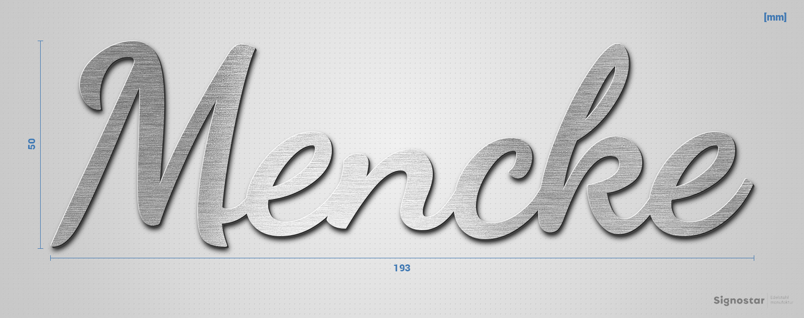 Hochwertiger, witterungsbeständiger Schriftzug "Mencke" aus gebürstetem Edelstahl V2A (1.4301)