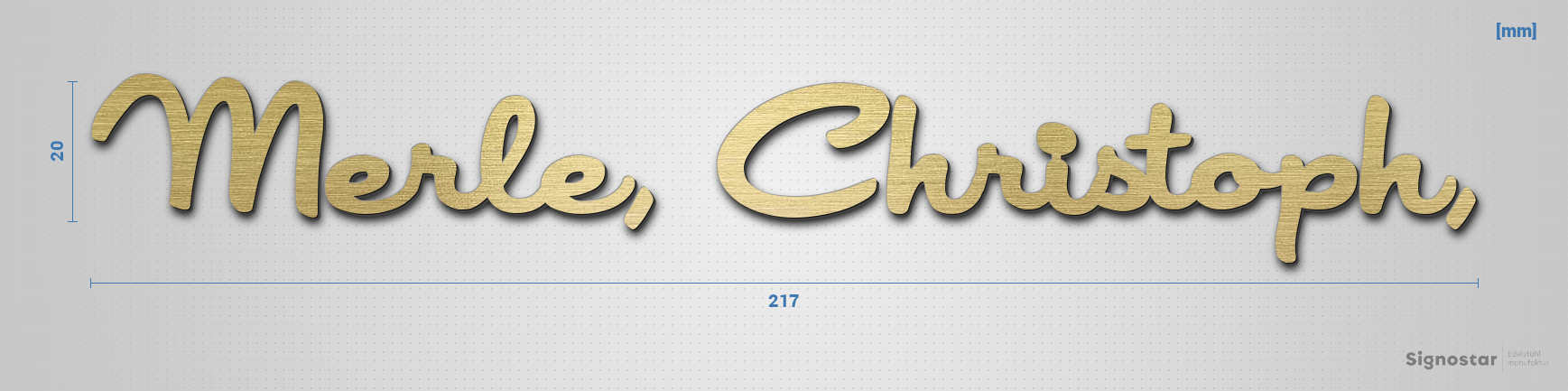 Schriftzug "Merle, Christoph," in Schriftart "Lilly", Acryl-Kunststoff in Messing-Optik gebürstet -