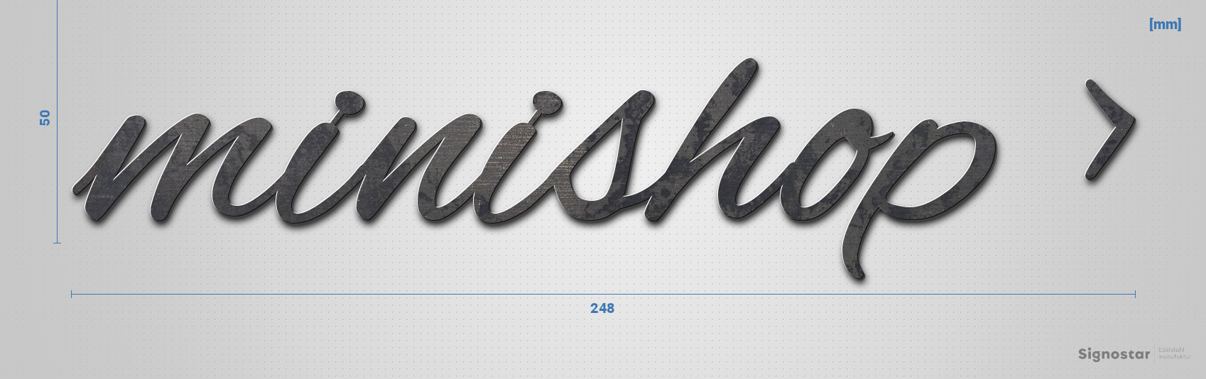 Schriftzug "minishop >" in Schriftart "Jessari", Cortenstahl unbehandelt - hochwertig & wetterbestän
