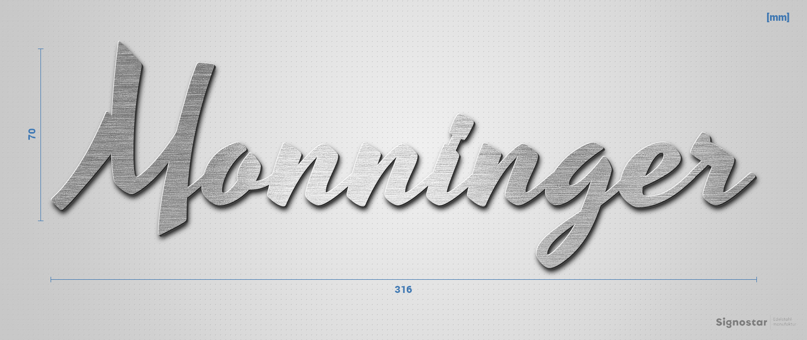 Hochwertiger, witterungsbeständiger Schriftzug "Monninger" aus gebürstetem Edelstahl V2A (1.4301)