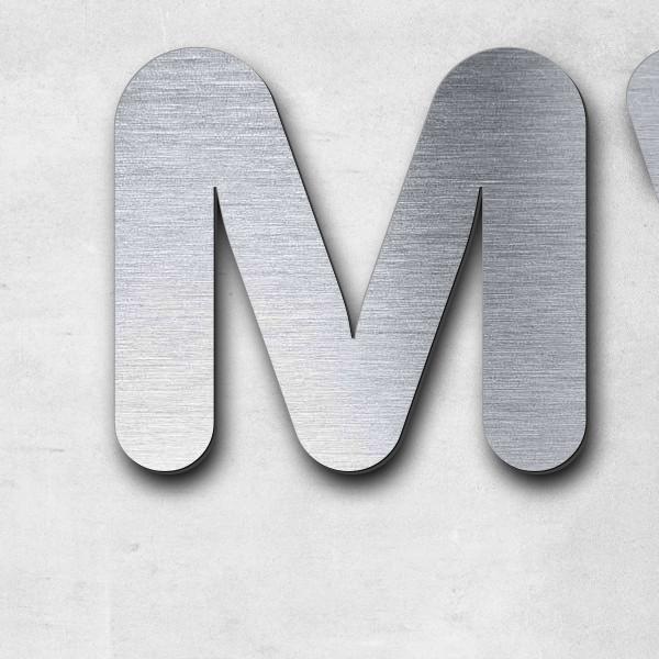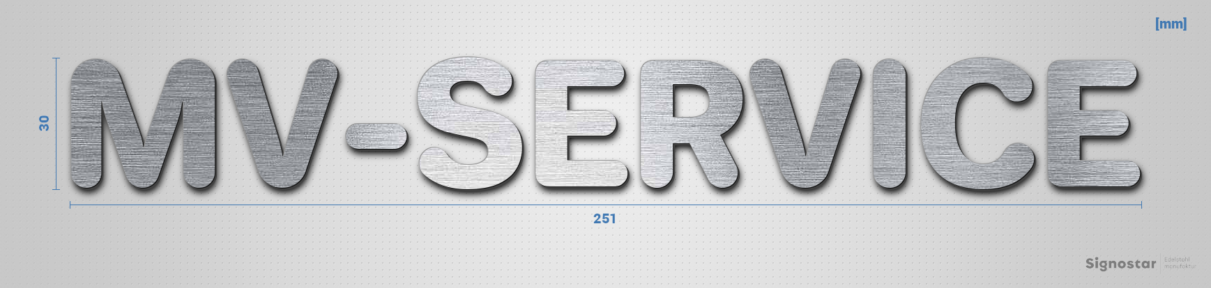 Hochwertiger, witterungsbeständiger Schriftzug "MV-SERVICE" aus Acryl-Kunststoff mit Oberfläche in Edelstahl-Optik, gebürstet