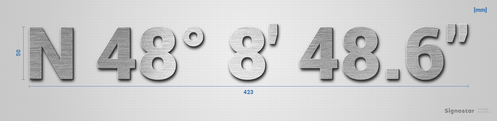 Schriftzug "N 48° 8′ 48.6″" in Schriftart "Sans", Edelstahl V2A gebürstet - hochwertig & wetterbestä