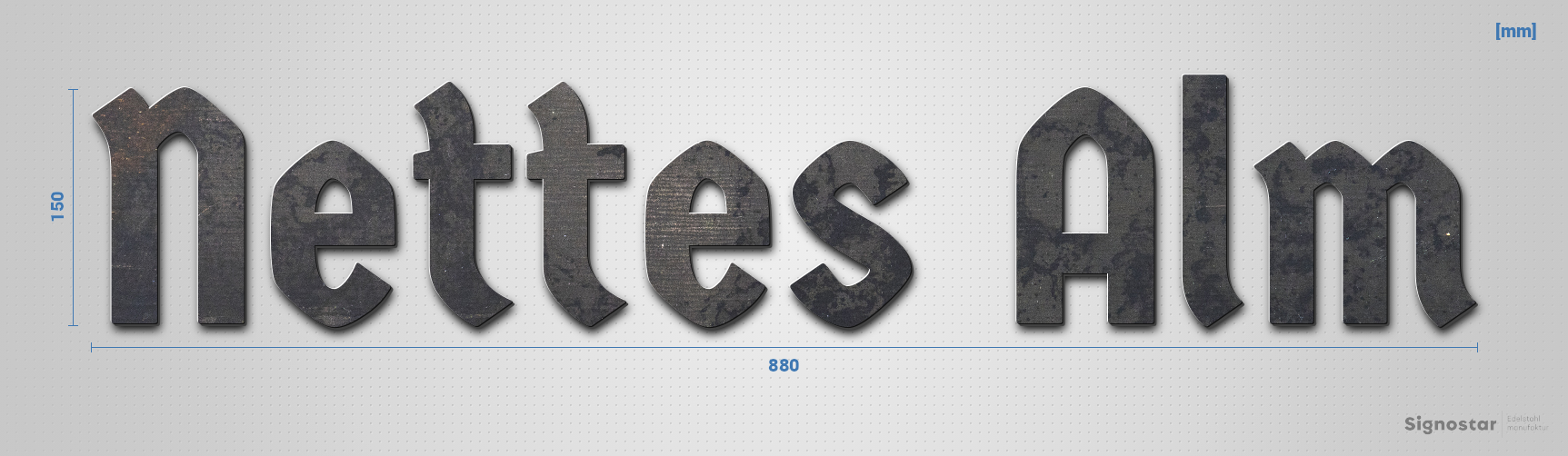 Schriftzug "Nettes Alm" in Schriftart "Fraktur", Cortenstahl unbehandelt - hochwertig & wetterbestän