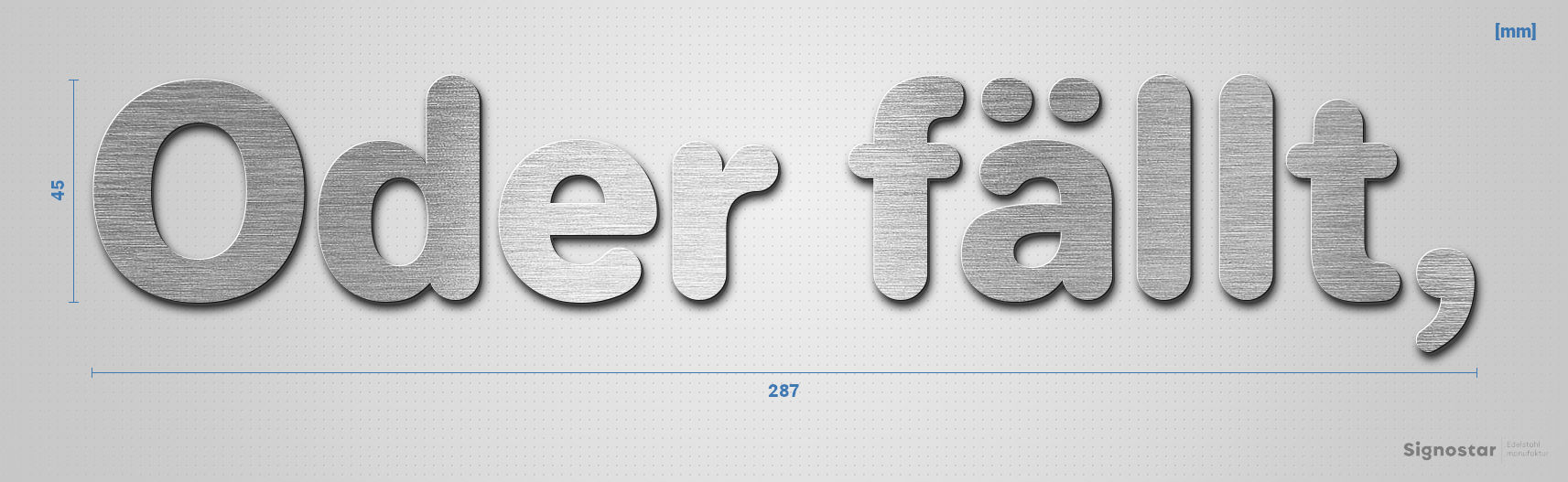 Schriftzüge bis zu einer Breite von 80cm stellen wir aus Edelstahl mit einer Materialstärke von 2mm her. Für größere Schriftzüge verwenden wir 3mm dicken Edelstahl. Auf Wunsch fertigen wir auch kleinere Schriftzüge mit einer Materialstärke von 3mm an.
