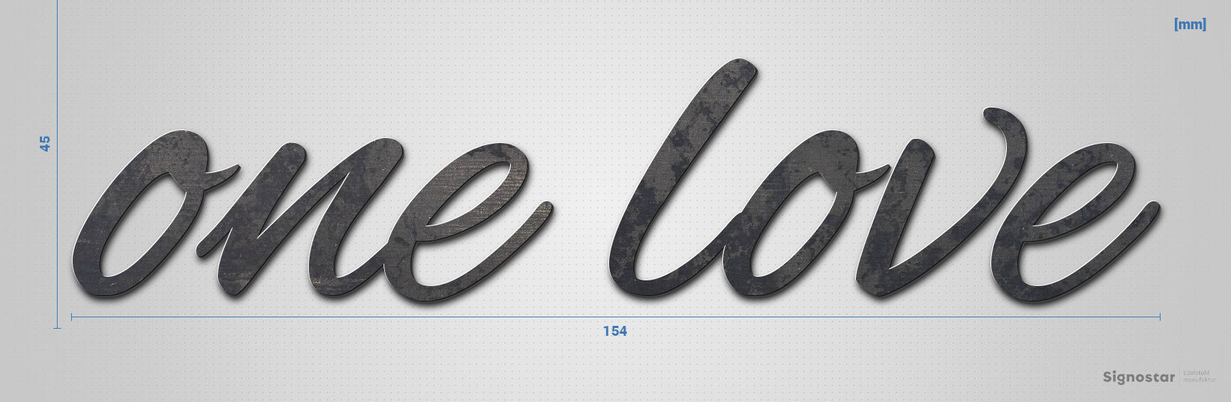 Schriftzug "one love" in Schriftart "Jessari", Cortenstahl unbehandelt - hochwertig & wetterbeständi
