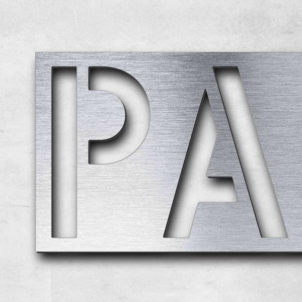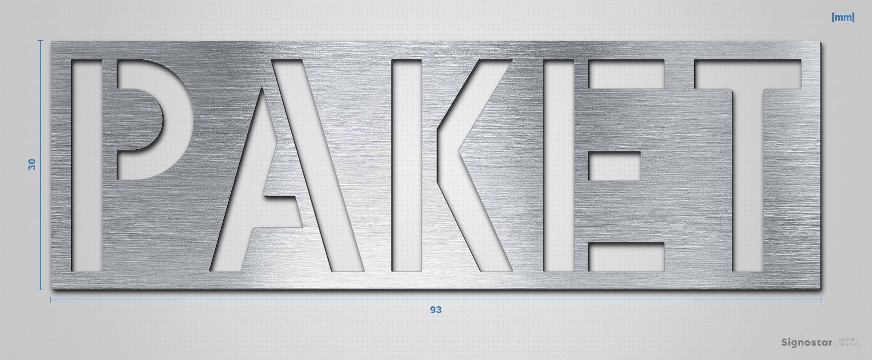 Schriftzug "Paket" in Schriftart "Blash", Acryl-Kunststoff in Edelstahl-Optik gebürstet - hochwertig
