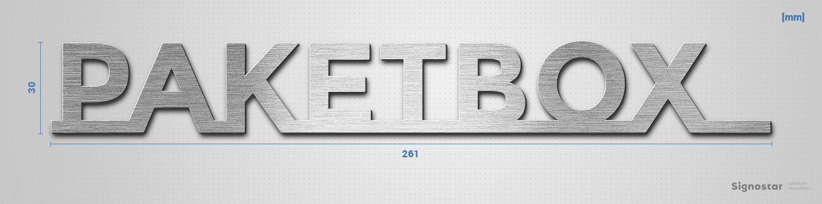 Hochwertiger, witterungsbeständiger Schriftzug "PAKETBOX ↑↑" aus gebürstetem Edelstahl V2A (1.4301)