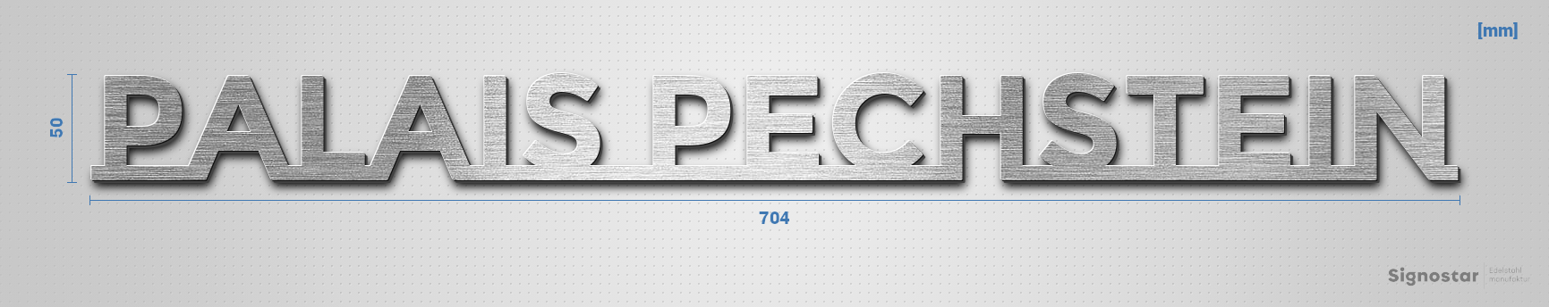 Hochwertiger, witterungsbeständiger Schriftzug "Palais Pechstein" aus gebürstetem Edelstahl V2A (1.4301)