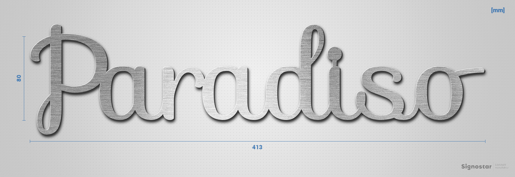 Hochwertiger, witterungsbeständiger Schriftzug "Paradiso" aus gebürstetem Edelstahl V2A (1.4301)