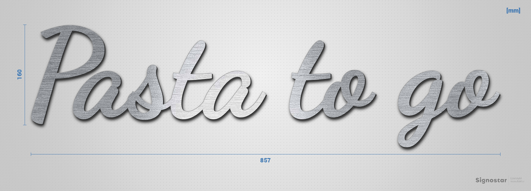 Hochwertiger, witterungsbeständiger Schriftzug "Pasta to go" aus Acryl-Kunststoff mit Oberfläche in Edelstahl-Optik, gebürstet