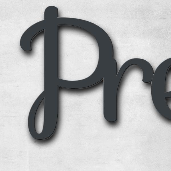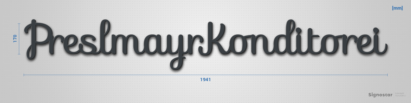 Schriftzug "PreslmayrKonditorei" in Schriftart "Autumna", Edelstahl V2A pulverbeschichtet - hochwert