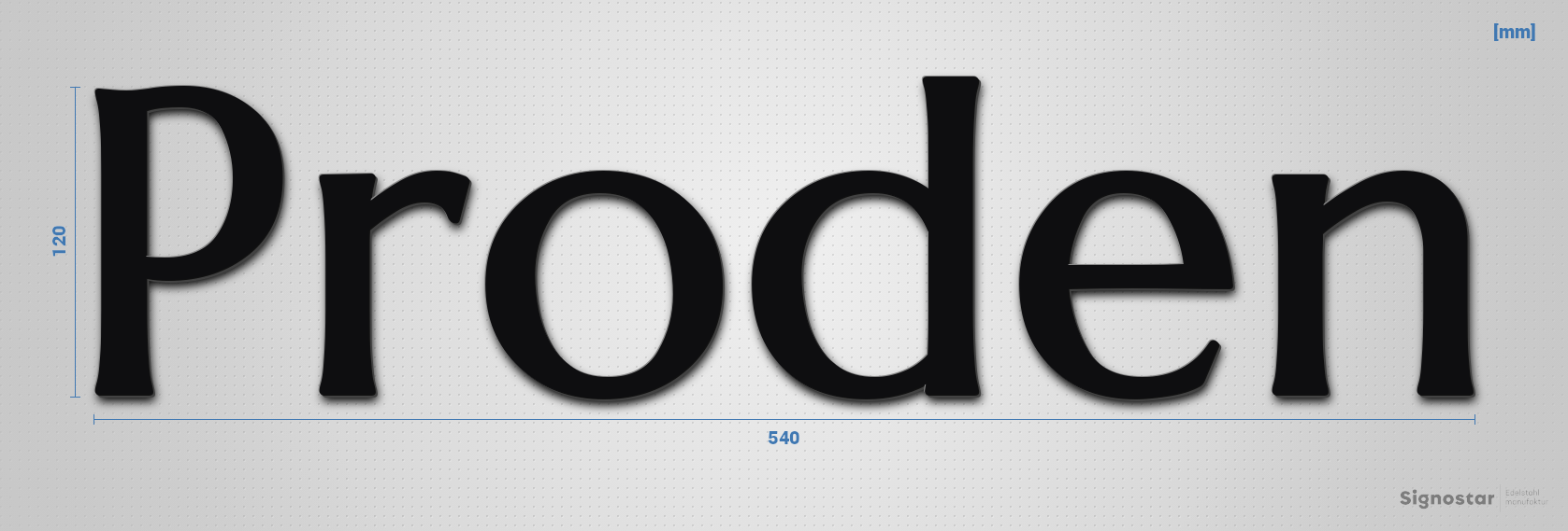 Schriftzug "Proden" in Schriftart "Eternitas", Edelstahl V2A pulverbeschichtet - hochwertig & wetter
