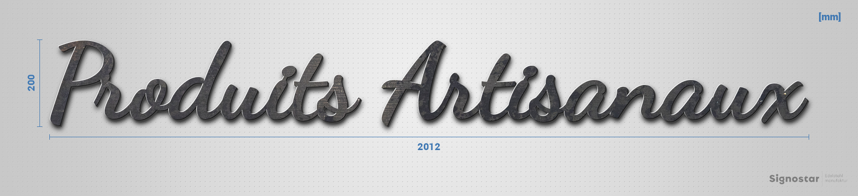 Schriftzug "Produits Artisanaux" in Schriftart "Filigrano", Cortenstahl unbehandelt - hochwertig & w