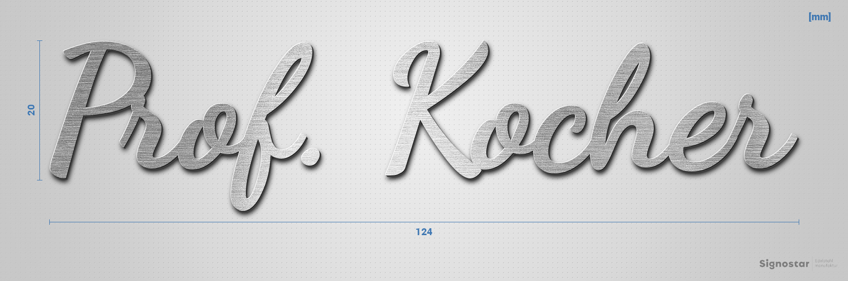Schriftzug "Prof. Kocher" in Schriftart "Filigrano", Edelstahl V2A gebürstet - hochwertig & wetterbe