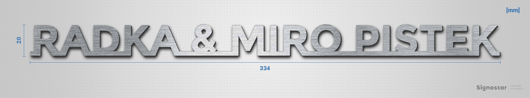 Hochwertiger, witterungsbeständiger Schriftzug "Radka & Miro Pistek" aus Acryl-Kunststoff mit Oberfläche in Edelstahl-Optik, gebürstet