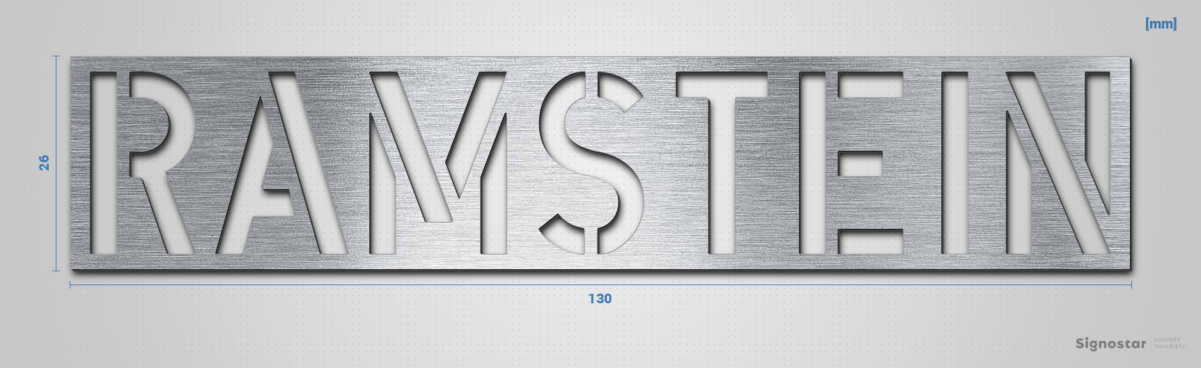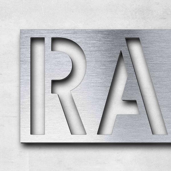 Hochwertiger, witterungsbeständiger Schriftzug "RAMSTEIN" aus Acryl-Kunststoff mit Oberfläche in Edelstahl-Optik, gebürstet