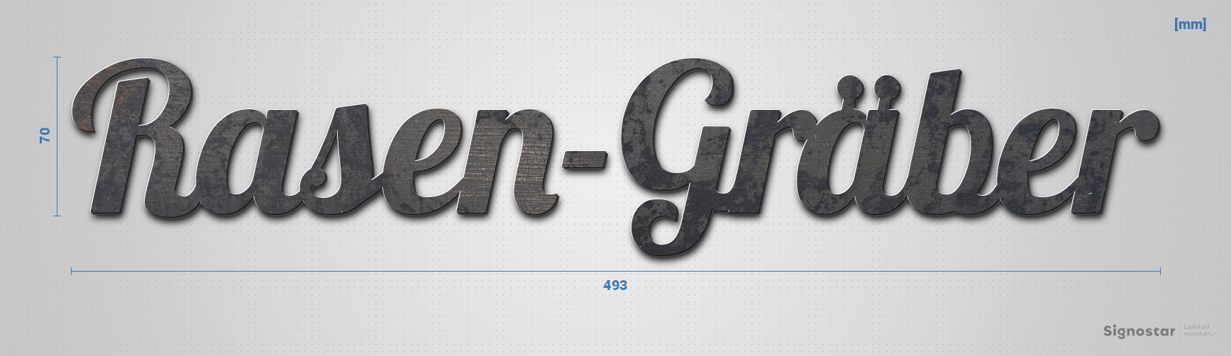 Hochwertiger, witterungsbeständiger Schriftzug "Rasen-Gräber" aus unbehandeltem Cortenstahl