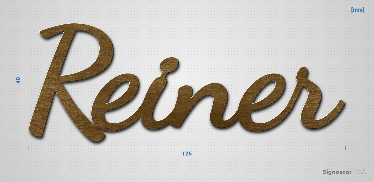Hochwertiger, witterungsbeständiger Schriftzug "Reiner" aus gebürstetem Messing