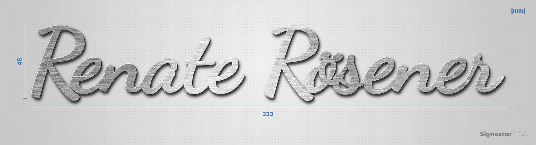 Hochwertiger, witterungsbeständiger Schriftzug "Renate Rösener" aus gebürstetem Edelstahl V2A (1.4301)