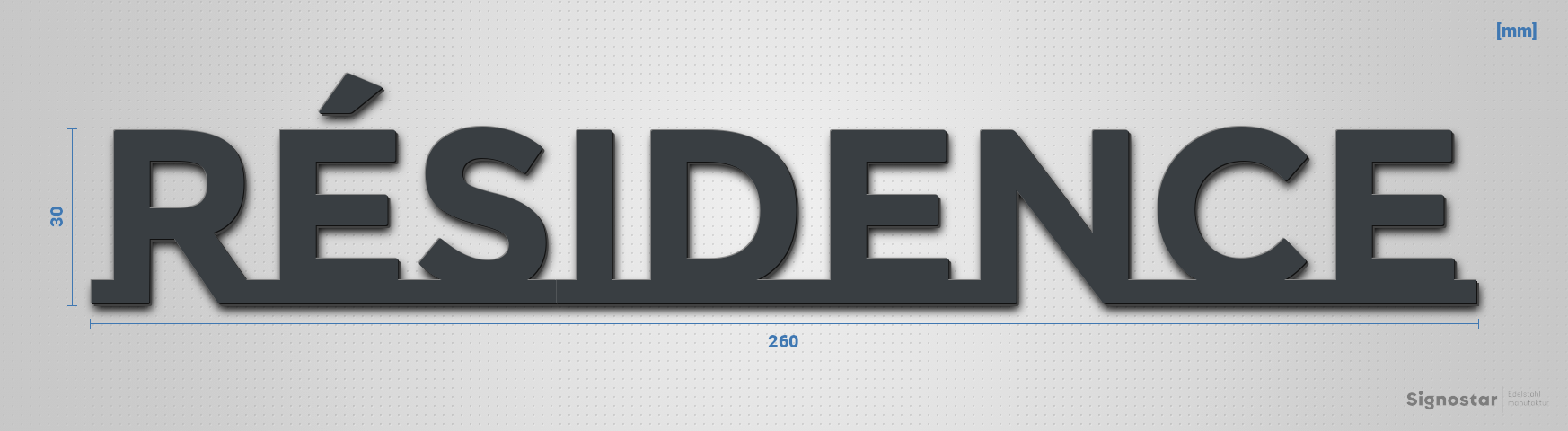 Schriftzug "Résidence" in Schriftart "Baseline", Edelstahl V2A pulverbeschichtet - hochwertig & wett