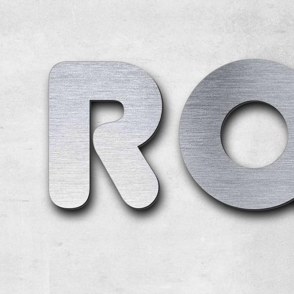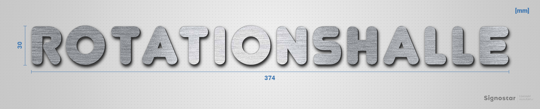 Hochwertiger, witterungsbeständiger Schriftzug "rotationshalle" aus Acryl-Kunststoff mit Oberfläche in Edelstahl-Optik, gebürstet