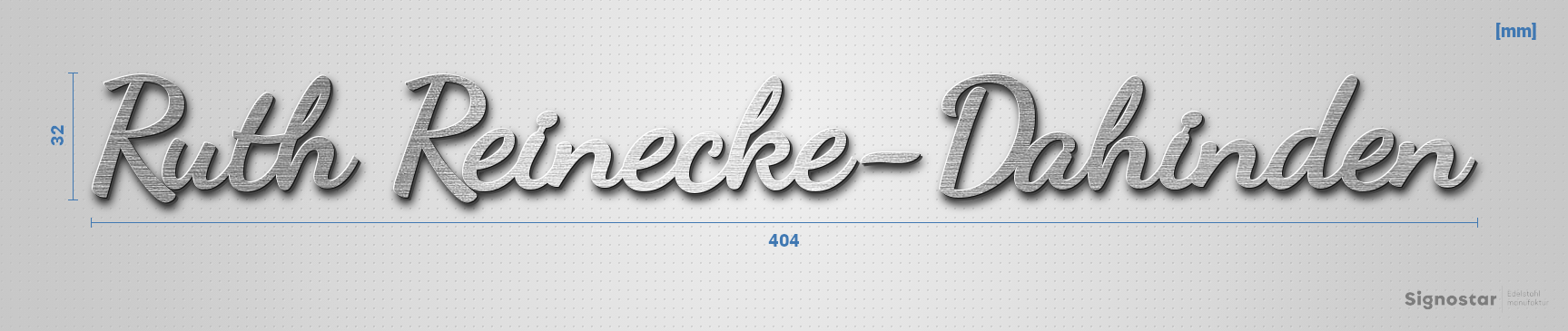 Schriftzug "Ruth Reinecke-Dahinden" in Schriftart "Filigrano", Edelstahl V2A gebürstet - hochwertig