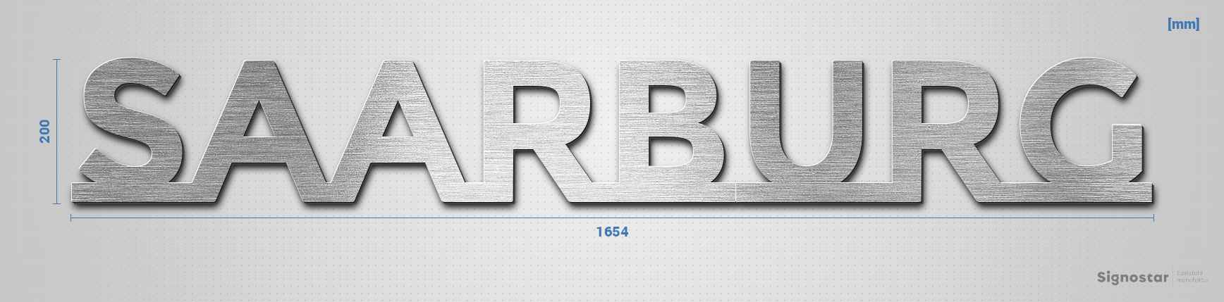 Hochwertiger, witterungsbeständiger Schriftzug "SAARBURG" aus gebürstetem Edelstahl V2A (1.4301)