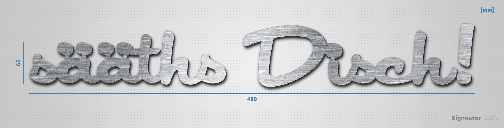 Hochwertiger, witterungsbeständiger Schriftzug "sääths Disch!" aus Acryl-Kunststoff mit Oberfläche in Edelstahl-Optik, gebürstet