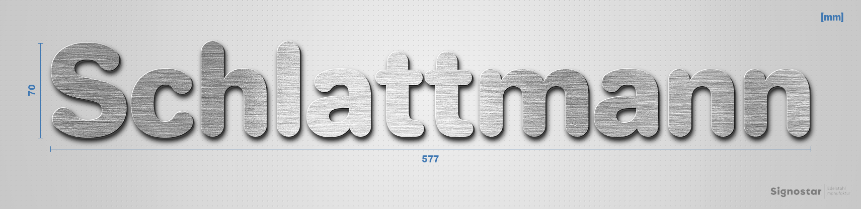 Hochwertiger, witterungsbeständiger Schriftzug "Schlattmann" aus gebürstetem Edelstahl V4A (1.4571)