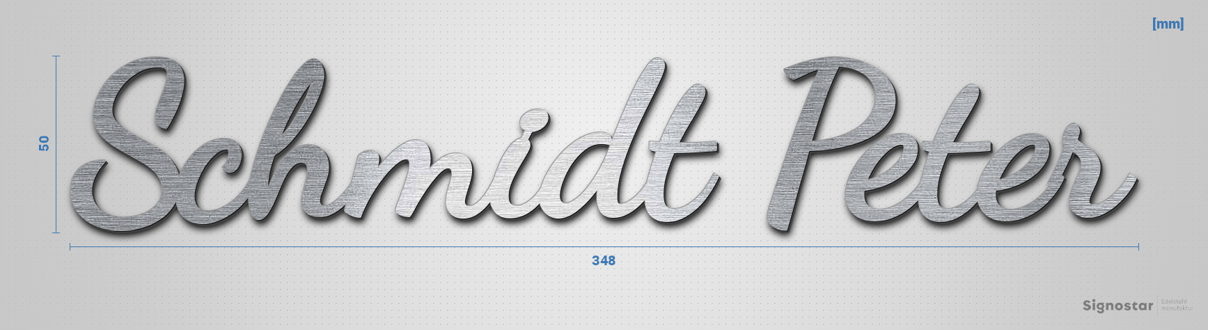 Hochwertiger, witterungsbeständiger Schriftzug "Schmidt Peter" aus Acryl-Kunststoff mit Oberfläche in Edelstahl-Optik, gebürstet