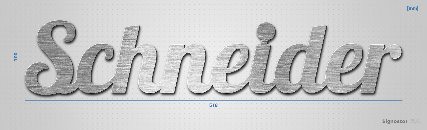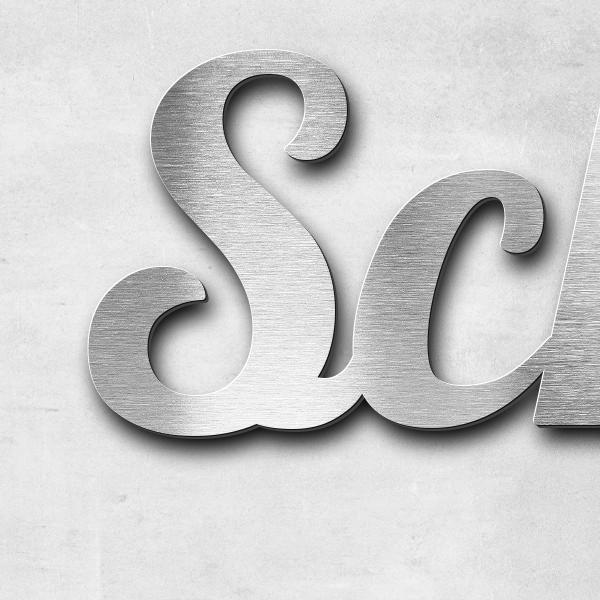 Hochwertiger, witterungsbeständiger Schriftzug "Schneider" aus gebürstetem Edelstahl V2A (1.4301)