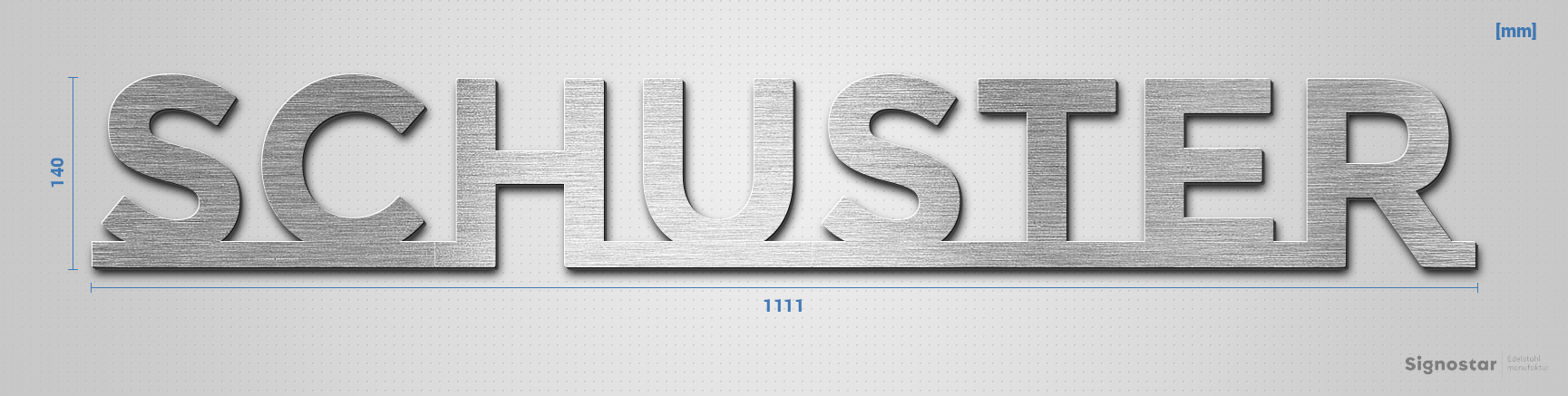 Hochwertiger, witterungsbeständiger Schriftzug "Schuster" aus gebürstetem Edelstahl V2A (1.4301)