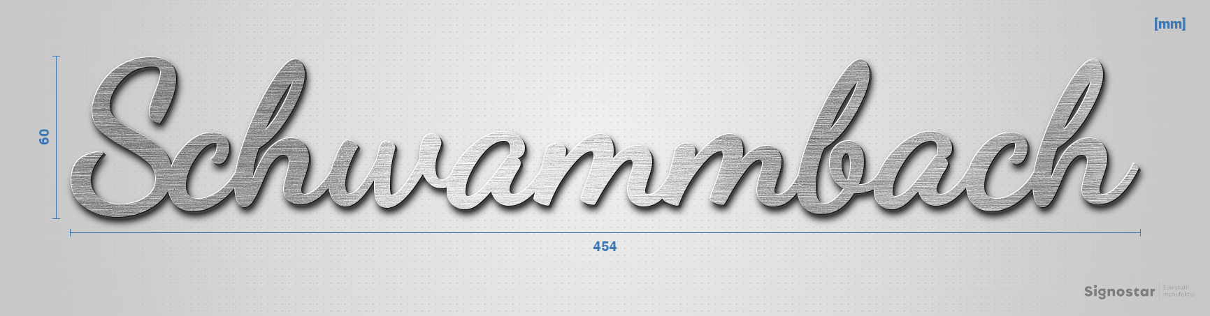Hochwertiger, witterungsbeständiger Schriftzug "Schwammbach" aus gebürstetem Edelstahl V2A (1.4301)