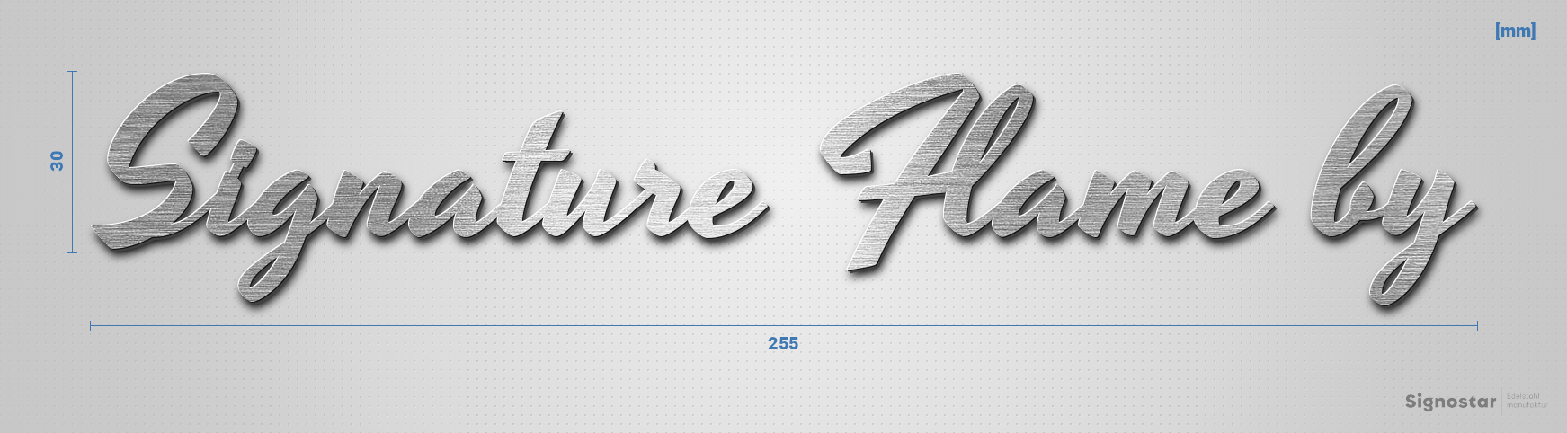 Hochwertiger, witterungsbeständiger Schriftzug "Signature Flame by" aus gebürstetem Edelstahl V2A (1.4301)