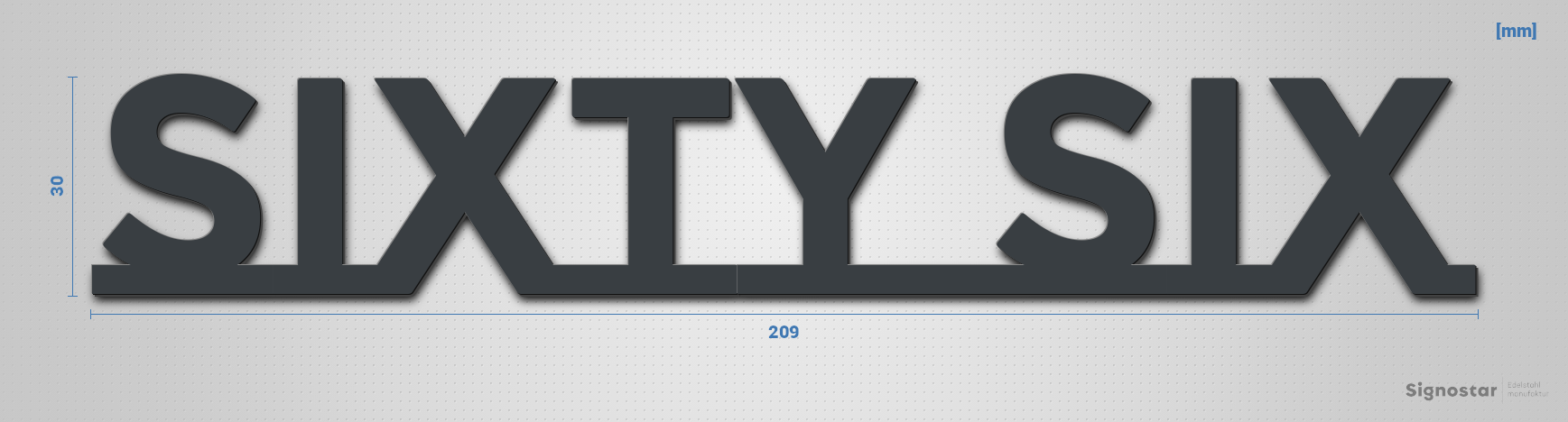 Hochwertiger, witterungsbeständiger Schriftzug "Sixty Six" aus pulverbeschichtetem Edelstahl V2A (1.4301)
