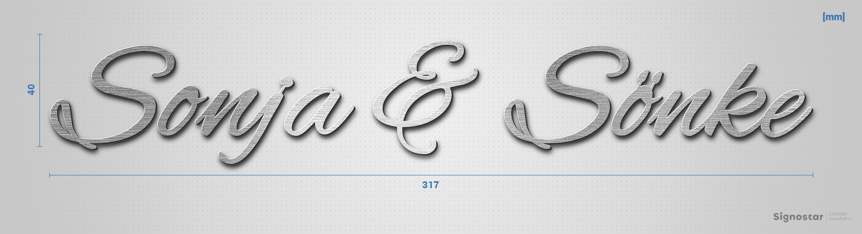 Schriftzug "Sonja & Sönke" in Schriftart "Jessari", Edelstahl V2A gebürstet - hochwertig & wetterbes