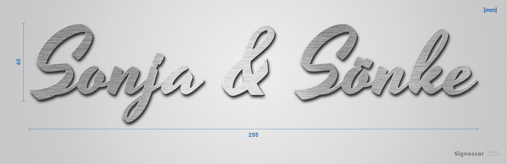 Hochwertiger, witterungsbeständiger Schriftzug "Sonja & Sönke" aus gebürstetem Edelstahl V2A (1.4301)