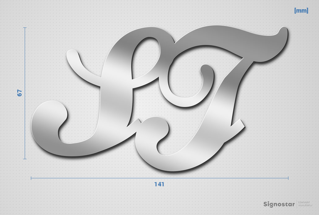 Hochwertiger, witterungsbeständiger Schriftzug "ST" aus spiegelpoliertem Edelstahl V2A (1.4301)