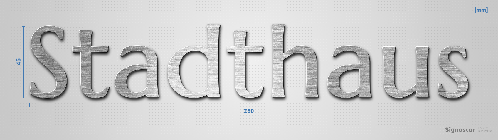 Schriftzüge bis zu einer Breite von 80cm stellen wir aus Edelstahl mit einer Materialstärke von 2mm her. Für größere Schriftzüge verwenden wir 3mm dicken Edelstahl. Auf Wunsch fertigen wir auch kleinere Schriftzüge mit einer Materialstärke von 3mm an.
