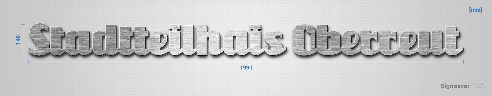 Hochwertiger, witterungsbeständiger Schriftzug "Stadtteilhais Oberreut" aus gebürstetem Edelstahl V2A (1.4301)