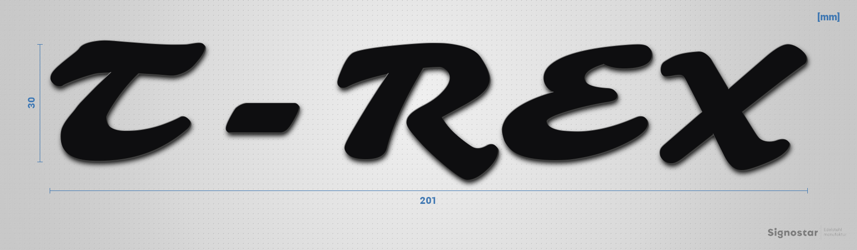 Hochwertiger, witterungsbeständiger Schriftzug "T-REX" aus pulverbeschichtetem Edelstahl V2A (1.4301)