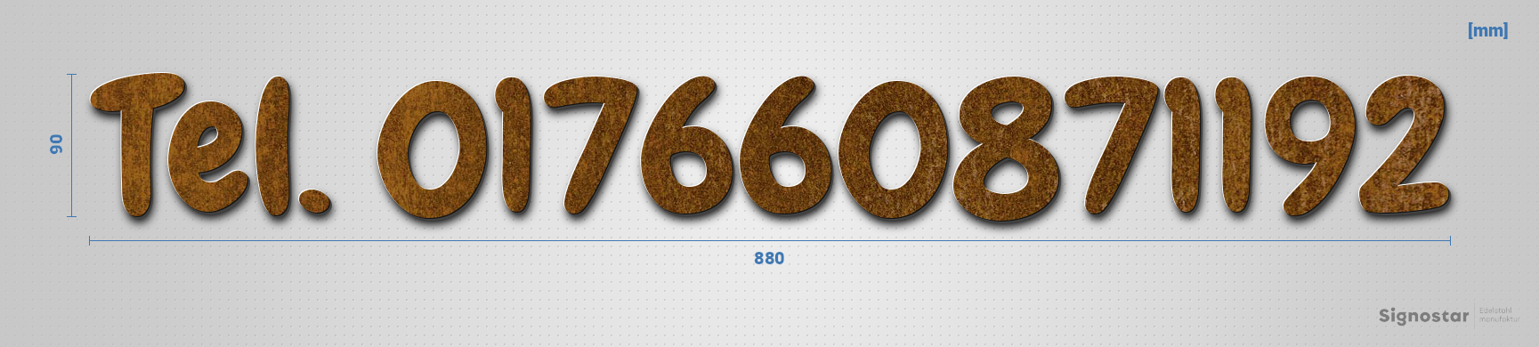 Hochwertiger, witterungsbeständiger Schriftzug "Tel. 017660871192" aus unbehandeltem Cortenstahl
