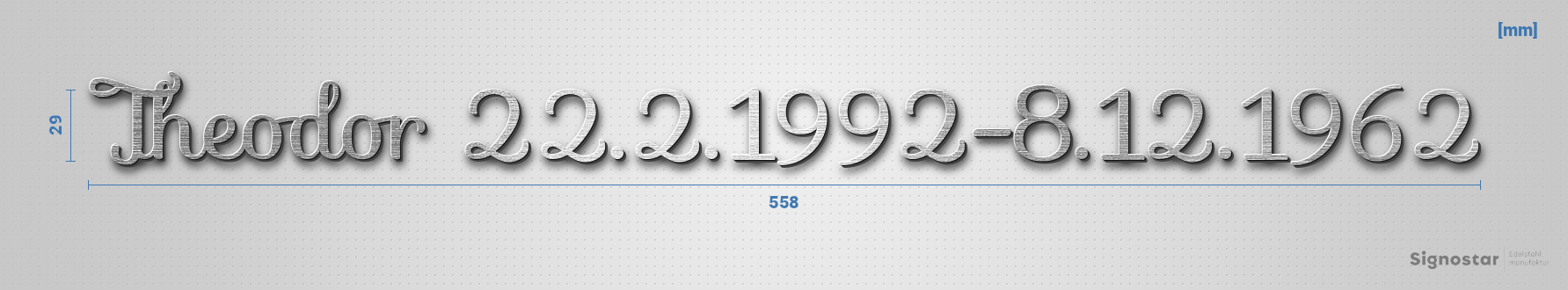 Schriftzug "Theodor 22.2.1992-8.12.1962" in Schriftart "Autumna", Edelstahl V2A gebürstet - hochwert
