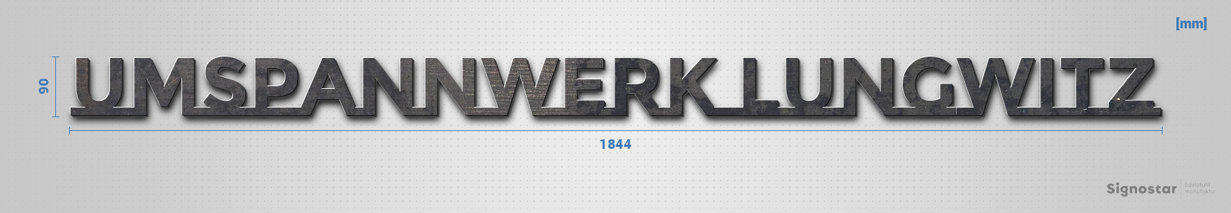Schriftzug "Umspannwerk Lungwitz" in Schriftart "Baseline", Cortenstahl unbehandelt - hochwertig & w