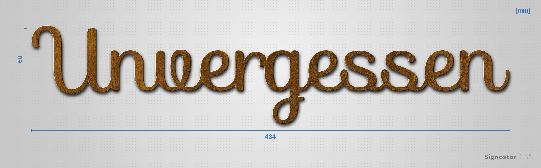 Schriftzug "Unvergessen" in Schriftart "Autumna", Cortenstahl voroxidiert - hochwertig & wetterbestä