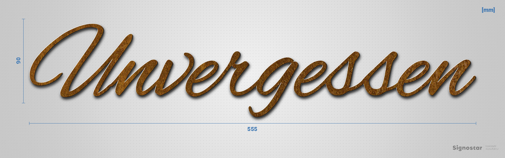 Schriftzug "Unvergessen" in Schriftart "Jessari", Cortenstahl voroxidiert - hochwertig & wetterbestä