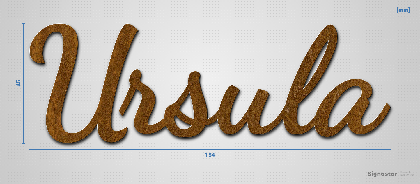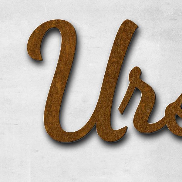 Hochwertiger, witterungsbeständiger Schriftzug "Ursula" aus unbehandeltem Cortenstahl