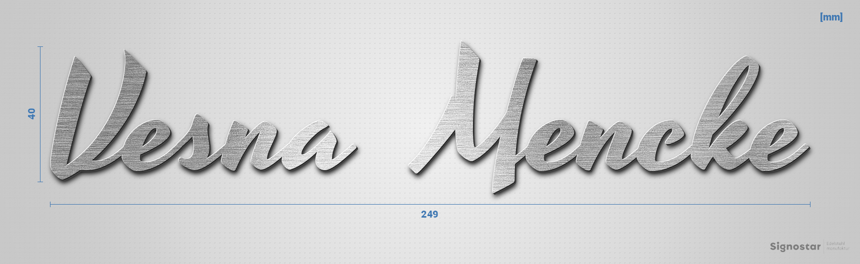 Hochwertiger, witterungsbeständiger Schriftzug "Vesna Mencke" aus gebürstetem Edelstahl V2A (1.4301)